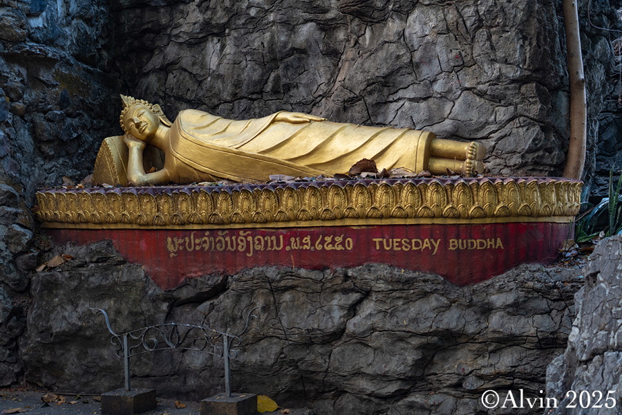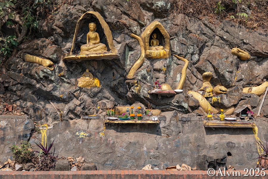 Der Aufstieg zum Gipfel erfolgt über eine Treppe mit zahlreichen Stufen, die mit kleinen Schreinen, Buddha-Statuen und bunten Gebetsfahnen gesäumt ist. Am oberen Ende des Hügels befindet sich der goldene Tempel Wat Chom Si, der im Sonnenlicht besonders schön leuchtet. Von der Spitze des Hügels aus hat man eine spektakuläre Aussicht auf die Stadt, die Flüsse und die umliegenden Berge – ideal für Fotos, besonders bei Sonnenuntergang oder Sonnenaufgang.