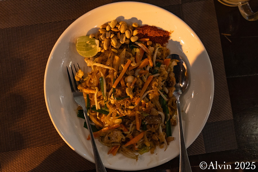 Später fuhren wir mit dem Tuk Tuk zurück und verbrachten den Sonnenuntergang am Mekong. Das wunderschöne Farbenspiel am Himmel war ein perfekter Abschluss des Tages. Da wir gestern so begeistert vom Bamboo Garden Restaurant waren, entschieden wir uns erneut dort zu essen und genossen ein köstliches Abendessen in entspannter Atmosphäre.