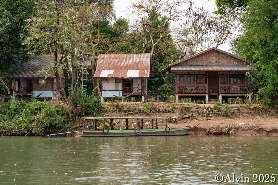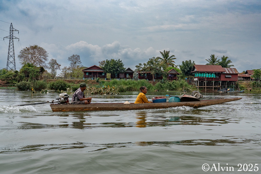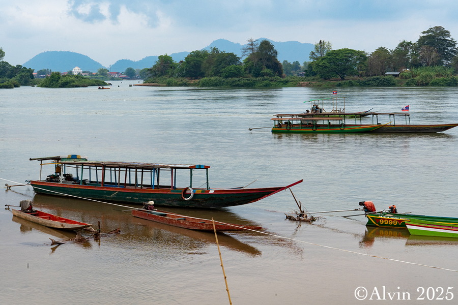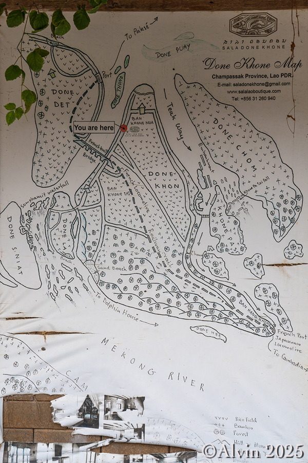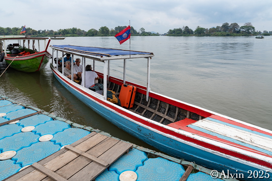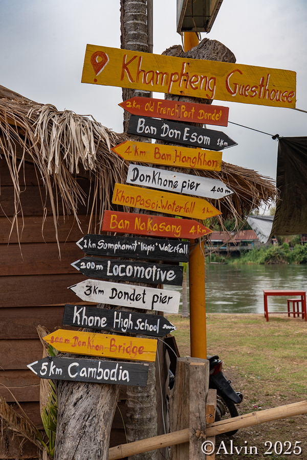 Nach einem Frühstück holte uns ein Minibus vom Hotel ab und brachte uns auf einer Strecke von etwa 140 km nach Nakosong. In der tropischen Flusslandschaft liegen circa 4.000 Inseln. Der Mekong erreicht hier an der Grenze zu Kambodscha seine größte Breite von beeindruckenden 14 Kilometern. Es ist ein Ort, an dem die Natur in ihrer vollen Pracht erstrahlt und wo man das Gefühl hat, in eine andere Welt einzutauchen. Ein Longboot brachte uns zu der Insel Don Khon und wir quartierten uns im Nongsak Guest House ein. Danach erkundeten wir die nähere Umgebung, darunter die alte Eisenbahnbrücke und das Railway Memorial, wo eine historische französische Lokomotive ausgestellt ist.
