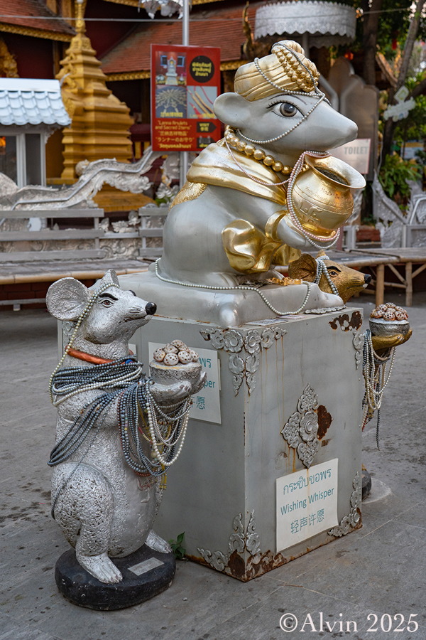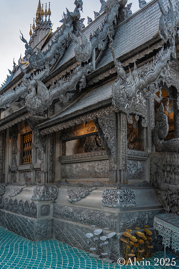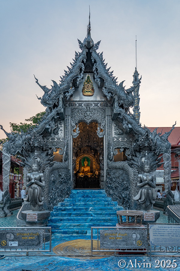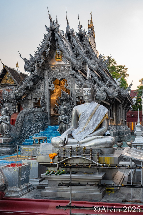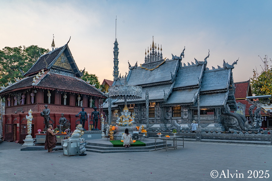Am Abend besichtigten wir den Silbernen Tempel von Chiang Mai, auch bekannt als Wat Sri Suphan. Dieser beeindruckende Tempel ist berühmt für seine kunstvollen silbernen Verzierungen und die detaillierte Handwerkskunst. Besonders abends, wenn das Licht auf die silbernen Oberflächen fällt, wirkt der Tempel magisch und strahlend. Der Wat Sri Suphan ist ein faszinierender Ort, der die reiche kulturelle Tradition Thailands widerspiegelt und einen Besuch absolut wert ist, um die spirituelle Atmosphäre und die kunstvolle Architektur zu erleben.
