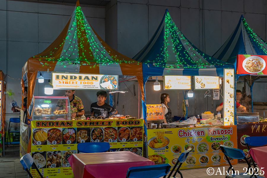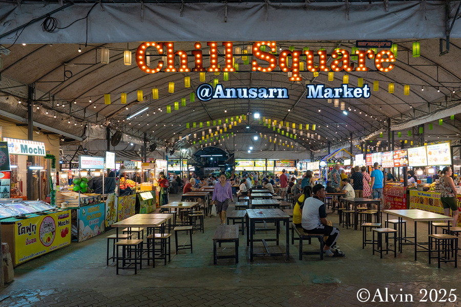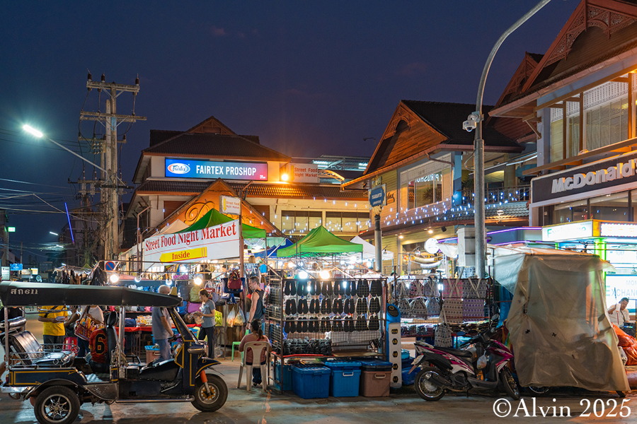 Vom silbernen Tempel fuhren wir mit dem Tuk Tuk zum Night Market, wo wir auch zu Abend aßen. Der Markt ist lebhaft und bietet eine Vielzahl von Ständen mit Souvenirs, Kleidung, Essen und anderen Waren. Allerdings sind viele der angebotenen Produkte eher entbehrlich oder von minderer Qualität. Es fällt auf, dass chinesische Käufer hier oft das Zehnfache für den Ramsch bezahlen, verglichen mit den Preisen in ihrem Heimatland, da die Produkte meist importiert oder überteuert verkauft werden. Trotz dieser Beobachtungen ist der Night Market ein beliebter Ort, um das lokale Leben zu erleben und die Atmosphäre Chiang Mais zu genießen.
