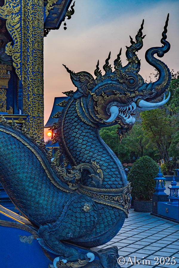 Mit einem Songthaew (Sammeltaxi) fuhren wir für 25 Baht zurück in die Stadt. Am Nachmittag besuchten wir den Blauen Tempel (Wat Rong Suea Ten), der sich etwa 3 km nördlich des Stadtzentrums befindet. Der Eintritt ist kostenlos, was ihn zu einer weiteren lohnenden Attraktion macht. Der Blaue Tempel wurde von dem Künstler Phuttha Kabkaew entworfen und ist relativ neu, da er erst 2016 fertiggestellt wurde.